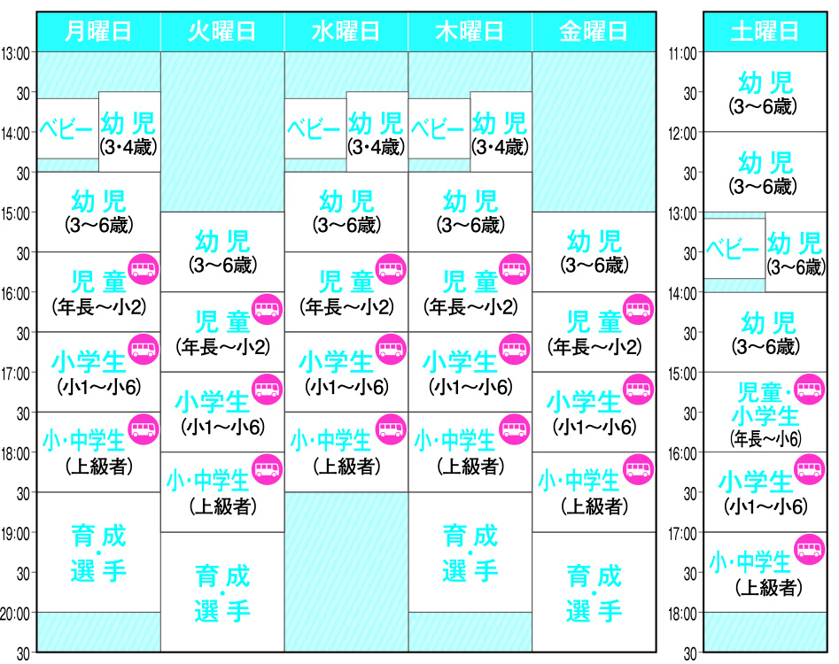 練習時間1時間(育成コースは除く)、レベルに応じたクラス分け・人数編成です。週1コースは月~土曜までお好きな時間で、週2コースは 月・木 もしくは 火・金 のいずれかとなります。